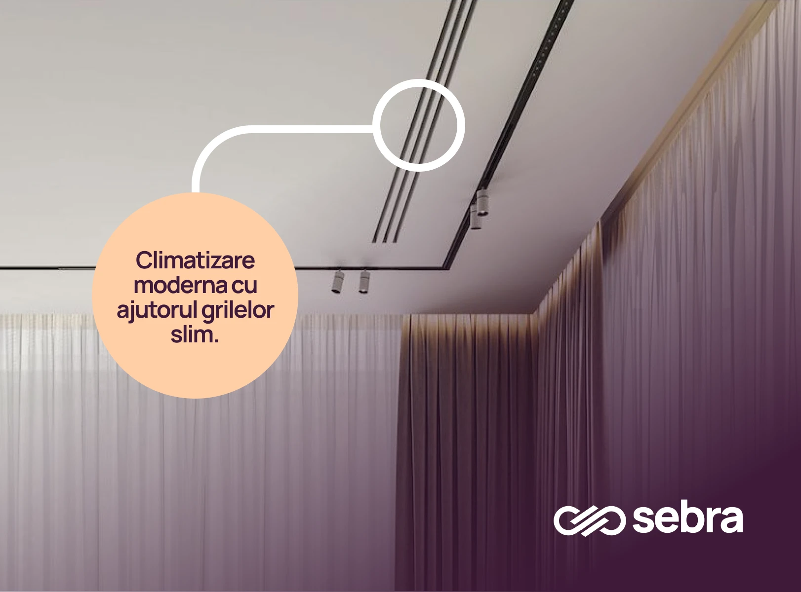 Aici intră în scenă grilele/difuzoarele liniare integrate în tavan, care “închid” estetic proiectul.